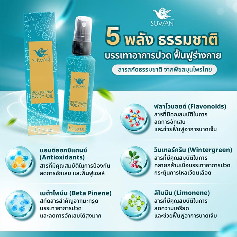 A light, moisturizing oil mist spray infused with concentrated Beta-Pinene, an innovative extract from kaffir lime with a higher pain relief index than diclofenac. Its natural citrus aroma helps alleviate pain while reducing stress and anxiety. Designed with a Spray & Go formula, it?s easy to use?just spray and it dries quickly, no massage required.